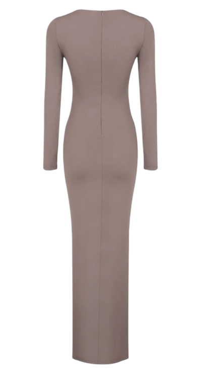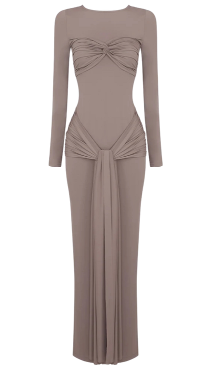 Vestido Largo Drapeado con Nudo Frontal – Chocolate